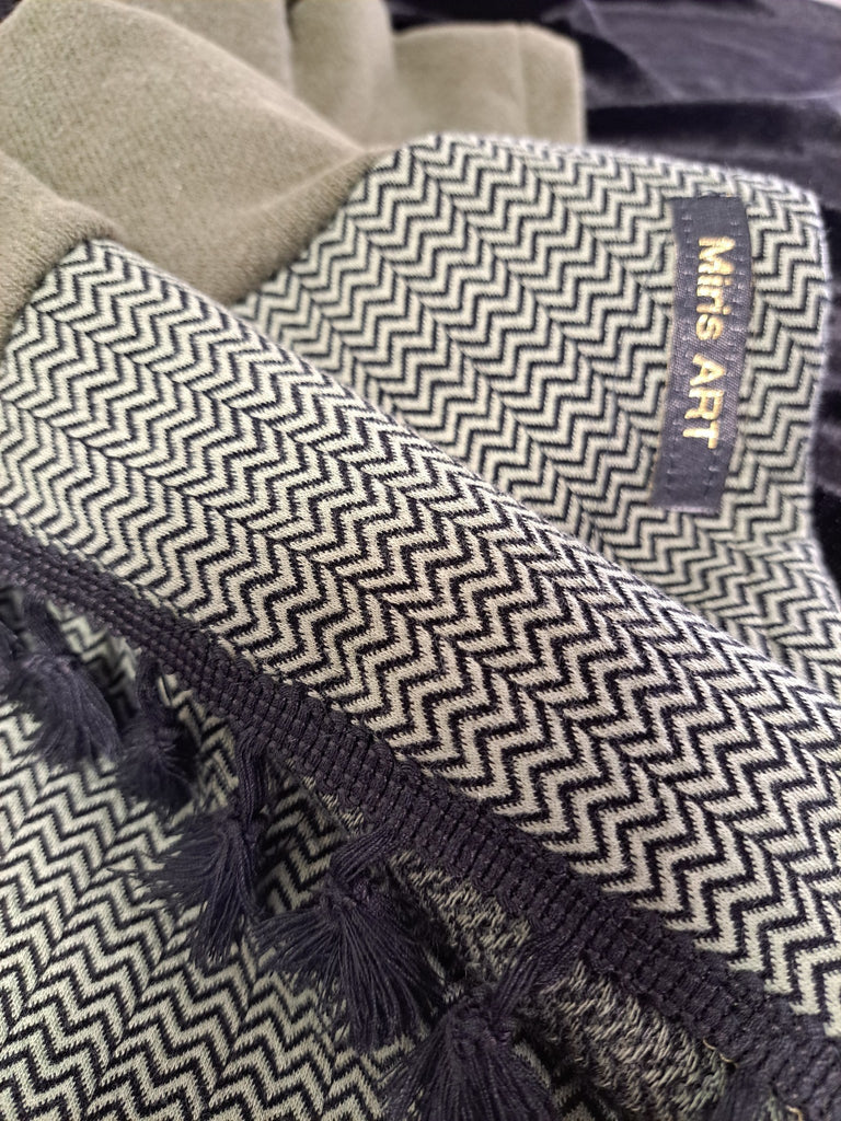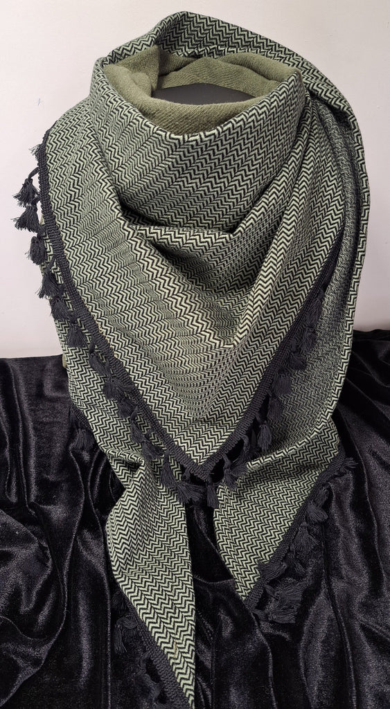 Aufwendig mit schwarzen Quasten hergestellt und superlässig zeigt sich das cosy Traumtuch in olive/grün/schwarz.
